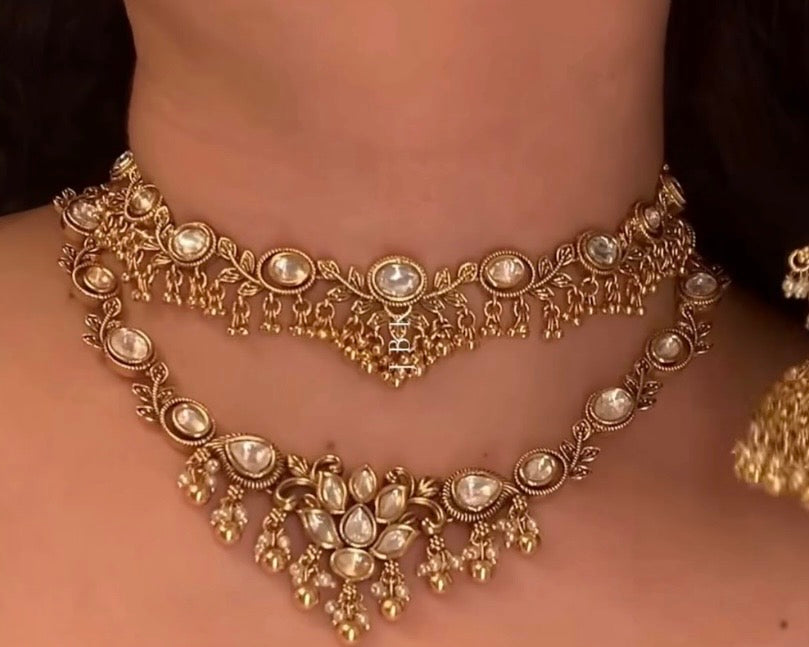 Royal Antique Gold Plated Multi-Layer Necklace Set with Earrings